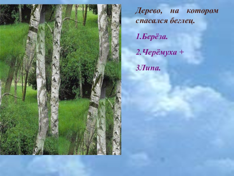 Дерево, на котором спасался беглец.1.Берёза.2.Черёмуха +3Липа.