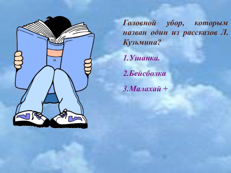 Головной убор, которым назван один из рассказов Л.Кузьмина?1.Ушанка.2.Бейсболка3.Малахай +