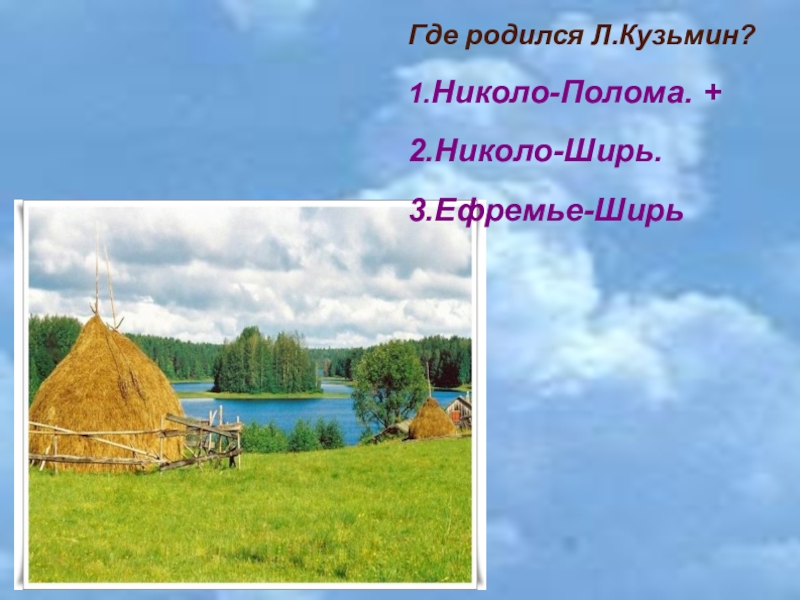 Где родился Л.Кузьмин?1.Николо-Полома. +2.Николо-Ширь.3.Ефремье-Ширь