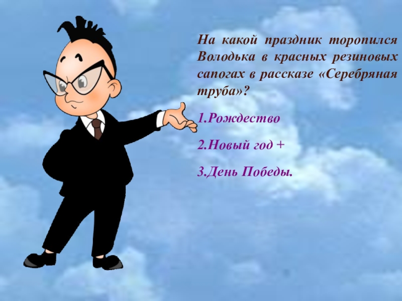 На какой праздник торопился Володька в красных резиновых сапогах в рассказе «Серебряная труба»?1.Рождество2.Новый год +3.День Победы.