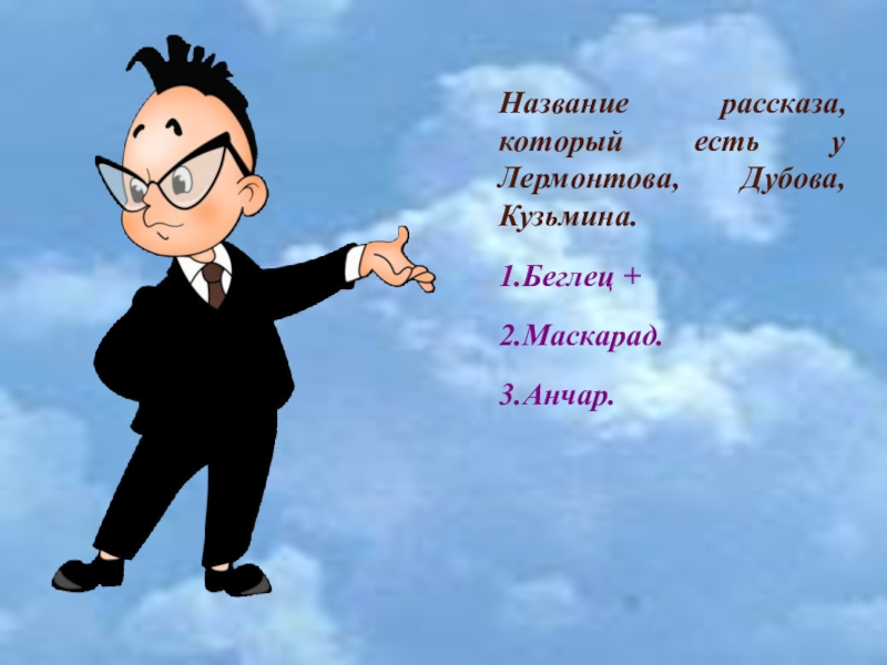 Слайд 9Название рассказа, который есть у Лермонтова, Дубова, Кузьмина.