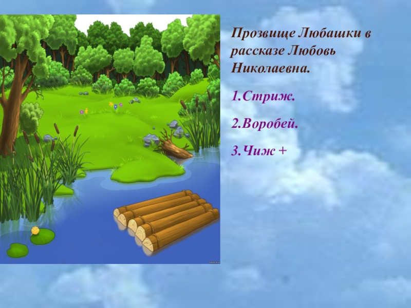 Прозвище Любашки в рассказе Любовь Николаевна.1.Стриж.2.Воробей.3.Чиж +