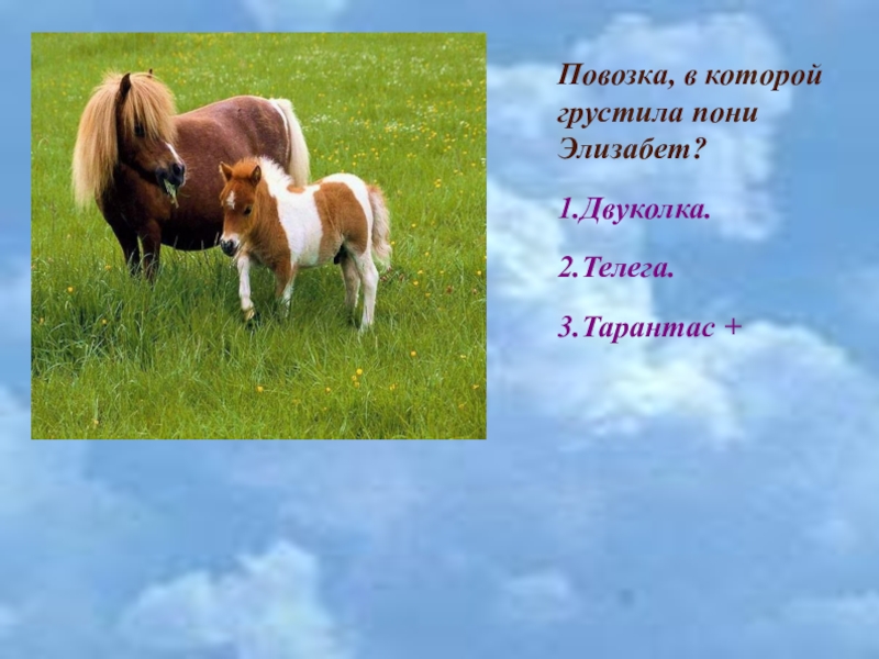 Повозка, в которой грустила пони Элизабет?1.Двуколка.2.Телега.3.Тарантас +