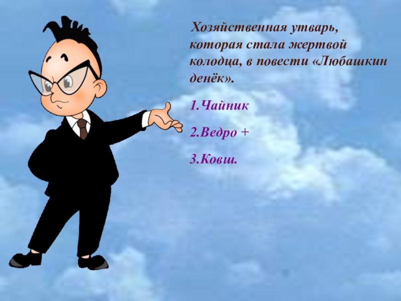 .Хозяйственная утварь, которая стала жертвой колодца, в повести «Любашкин денёк».1.Чайник2.Ведро +3.Ковш.