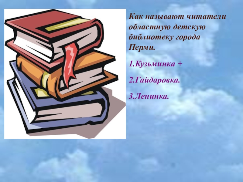 Как называют читатели областную детскую библиотеку города Перми.1.Кузьминка +2.Гайдаровка.3.Ленинка.