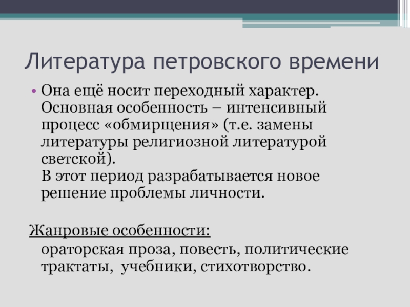процесс «обмирщения» (т.е. замены литературы религиозной литературой светской). В этот период разрабатывается новое решение проблемы личности.