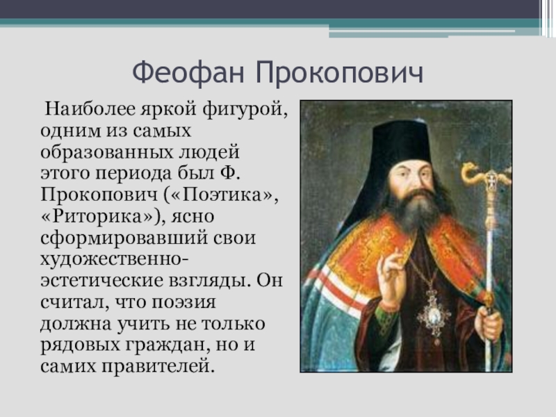 людей этого периода был Ф.Прокопович («Поэтика», «Риторика»), ясно сформировавший свои художественно- эстетические взгляды. Он считал, что поэзия должна учить не только рядовых граждан, но и самих правителей.