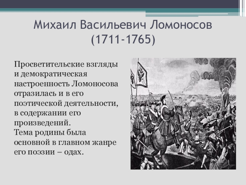картины о Полтавской баталии, создатель торжественных од, реформатор языка и автор «Письма о правилах российского стихотворства», «Краткого руководства к красноречию», «Грамматики», теории трёх штилей.