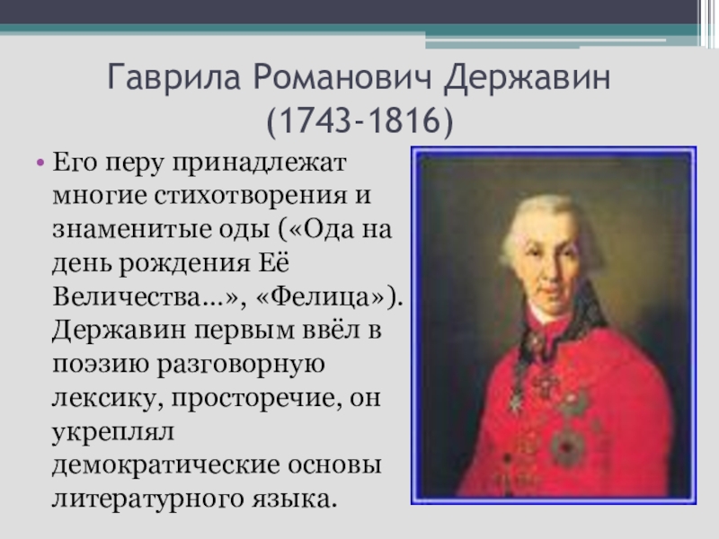 («Ода на день рождения Её Величества…», «Фелица»). Державин первым ввёл в поэзию разговорную лексику, просторечие, он укреплял демократические основы литературного языка.