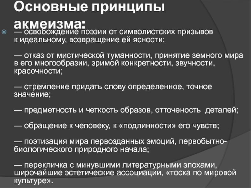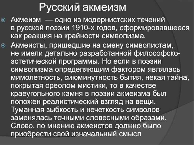Акмеисты, пришедшие на смену символистам, не имели детально разработанной философско-эстетической программы. Но если в поэзии символизма определяющим фактором являлась мимолетность, сиюминутность бытия, некая тайна, покрытая ореолом мистики, то в качестве краеугольного камня в поэзии акмеизма был положен реалистический взгляд на вещи. Туманная зыбкость и нечеткость символов заменялась точными словесными образами. Слово, по мнению акмеистов должно было приобрести свой изначальный смысл