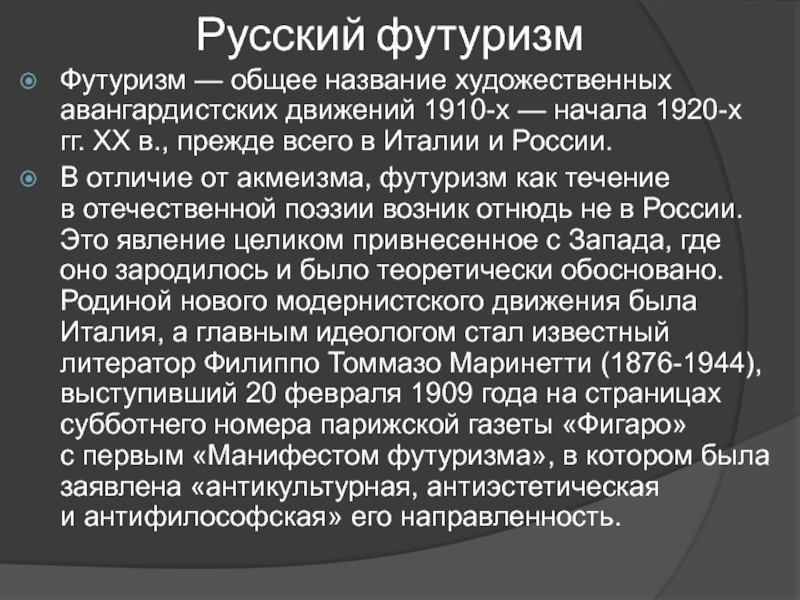 В отличие от акмеизма, футуризм как течение в отечественной поэзии возник отнюдь не в России. Это явление целиком привнесенное с Запада, где оно зародилось и было теоретически обосновано. Родиной нового модернистского движения была Италия, а главным идеологом стал известный литератор Филиппо Томмазо Маринетти (1876-1944), выступивший 20 февраля 1909 года на страницах субботнего номера парижской газеты «Фигаро» с первым «Манифестом футуризма», в котором была заявлена «антикультурная, антиэстетическая и антифилософская» его направленность.