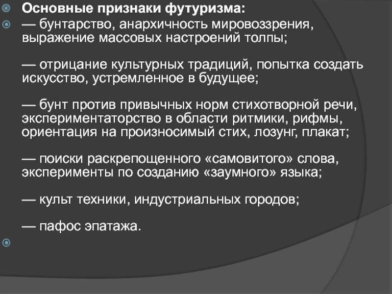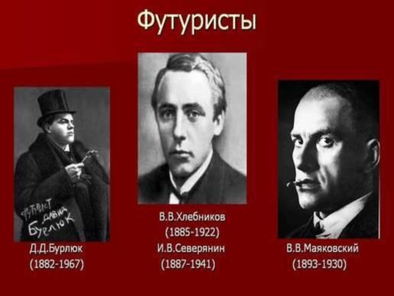 — бунт против привычных норм стихотворной речи, экспериментаторство в области ритмики, рифмы, ориентация на произносимый стих, лозунг, плакат;