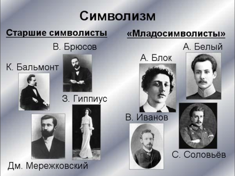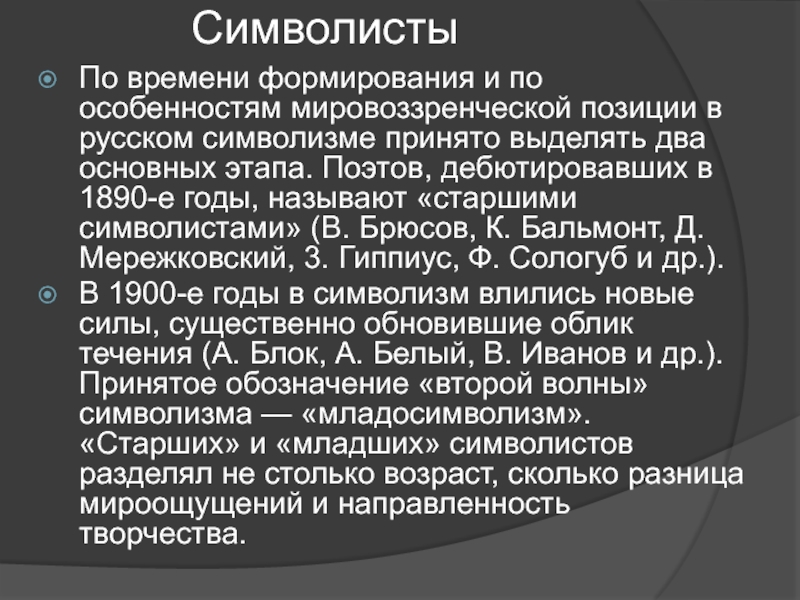 особенностям мировоззренческой позиции в русском символизме принято выделять два основных этапа. Поэтов, дебютировавших в 1890-е годы, называют «старшими символистами» (В. Брюсов, К. Бальмонт, Д. Мережковский, 3. Гиппиус, Ф. Сологуб и др.).