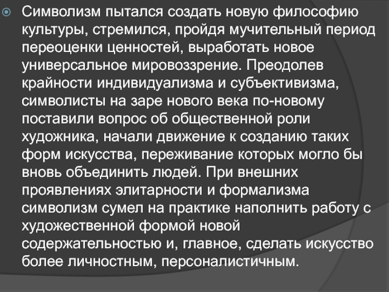 выработать новое универсальное мировоззрение. Преодолев крайности индивидуализма и субъективизма, символисты на заре нового века по-новому поставили вопрос об общественной роли художника, начали движение к созданию таких форм искусства, переживание которых могло бы вновь объединить людей. При внешних проявлениях элитарности и формализма символизм сумел на практике наполнить работу с художественной формой новой содержательностью и, главное, сделать искусство более личностным, персоналистичным.