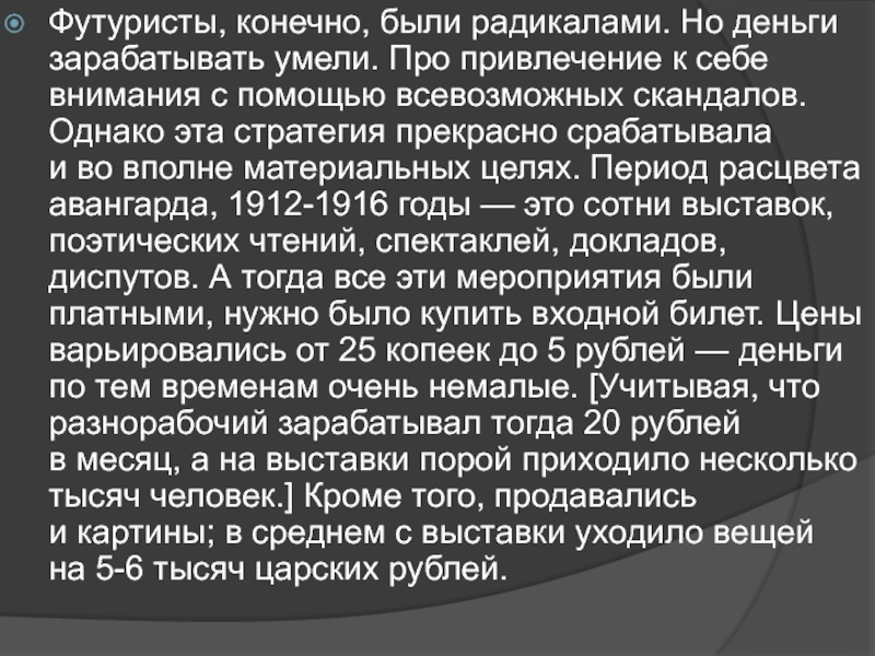 Слайд 11Футуристы, конечно, были радикалами. Но деньги зарабатывать умели. Про привлечение к себе внимания