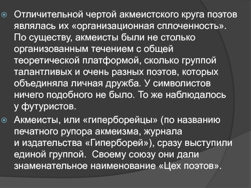 Слайд 7Отличительной чертой акмеистского круга поэтов являлась их «организационная сплоченность». По существу, акмеисты были