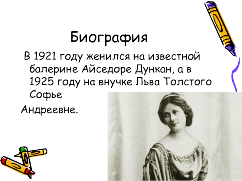 В 1921 году женился на известной балерине Айседоре Дункан,