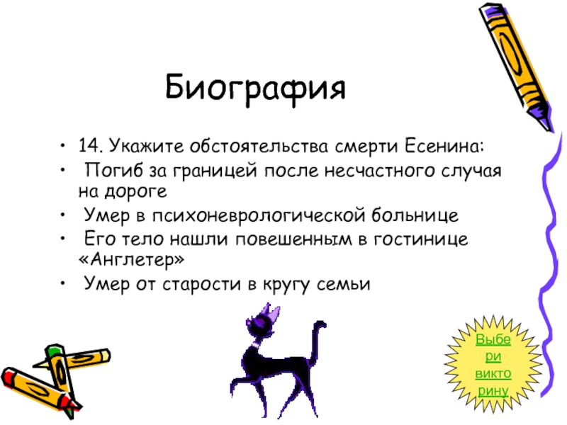 14. Укажите обстоятельства смерти Есенина: