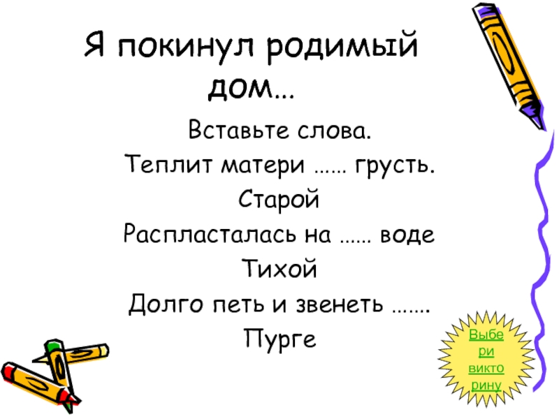 Слайд 39Я покинул родимый дом…
