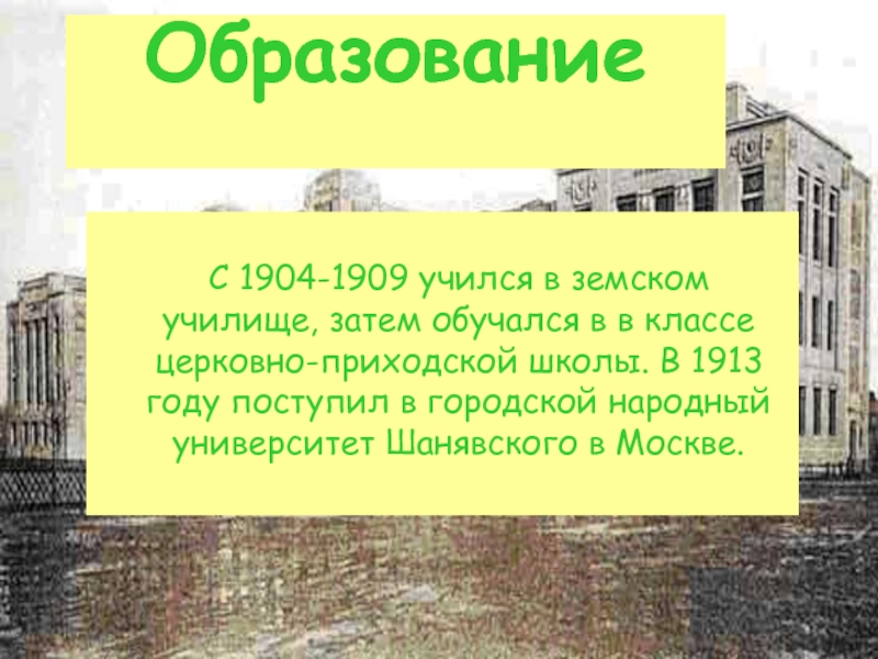 классе церковно-приходской школы. В 1913 году поступил в городской народный университет Шанявского в Москве.