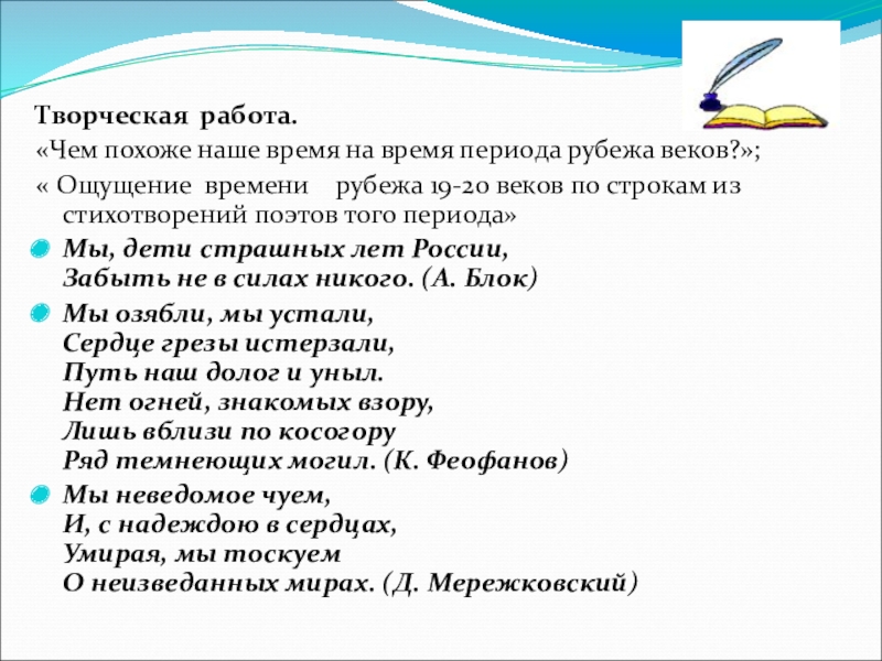 М.Горький: «Новый век – воистину будет веком духовного обновления(…)Множество погибнет людей, но ещё больше родит их земля, и – в конце концов – одолеет красота, справедливость, победят лучшие стремления человека»(1901).
