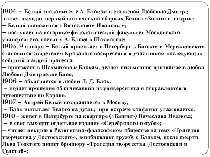 1913 – возвращаются в Россию; в Петербурге Белый знакомится с Ивановым, общается с Блоком, Мережковским, Гиппиус, Бердяевым; с группой русских антропософов выезжает в(Хельсинки), где читает лекции.