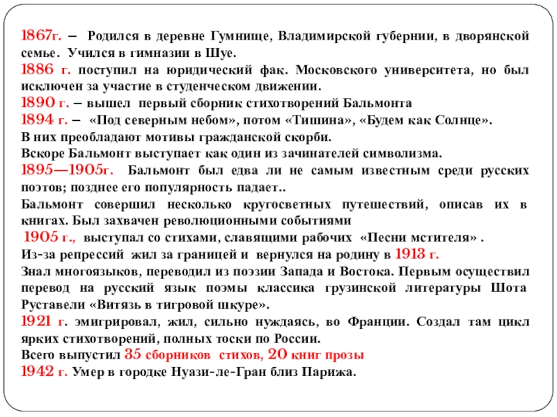 1890 г. – вышел первый сборник стихотворений Бальмонта