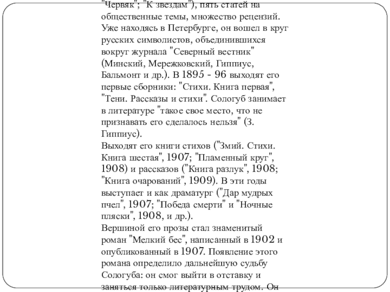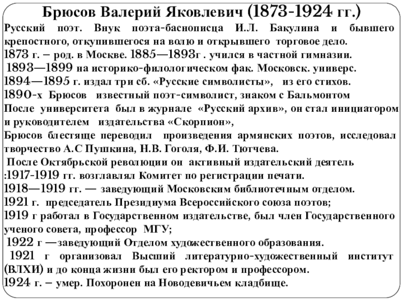 1901 знакомится с В. Брюсовым, Д. Мережковским и З. Гиппиус.