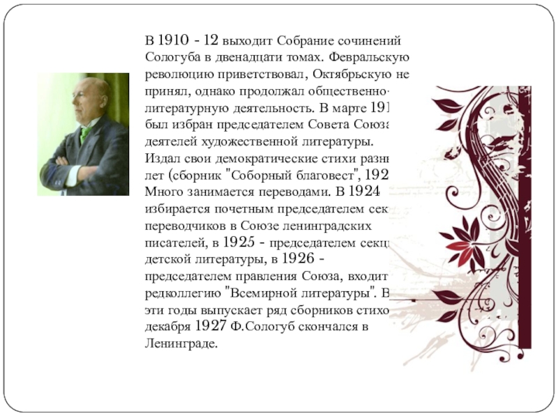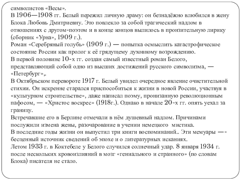 1928 – пишет автобиографический очерк «Почему я стал символистом и почему я не перестал им быть…» – публикует роман «Петербург»;