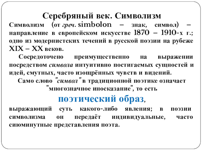 Сосредоточено преимущественно на выражении посредством символа интуитивно постигаемых сущностей и идей, смутных, часто изощрённых чувств и видений.