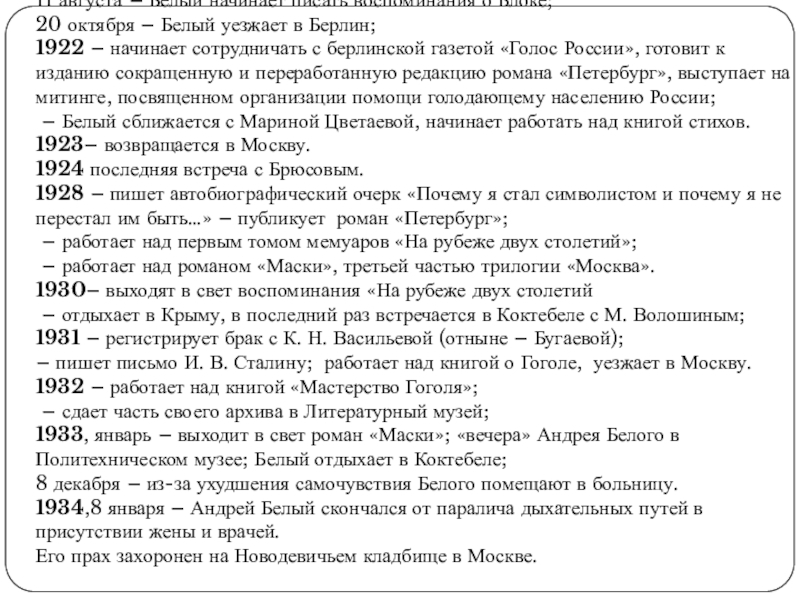 1922 – начинает сотрудничать с берлинской газетой «Голос России», готовит к изданию сокращенную и переработанную редакцию романа «Петербург», выступает на митинге, посвященном организации помощи голодающему населению России;