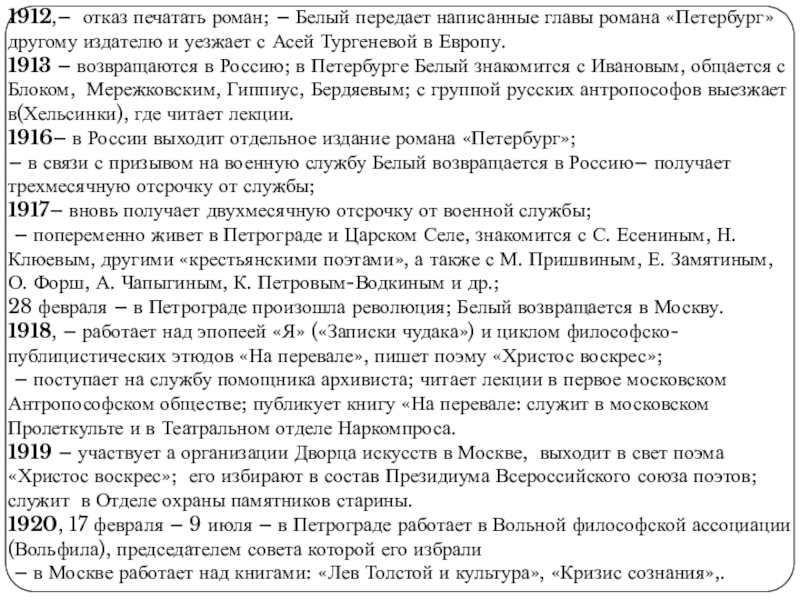 1912,– отказ печатать роман; – Белый передает написанные главы романа «Петербург»