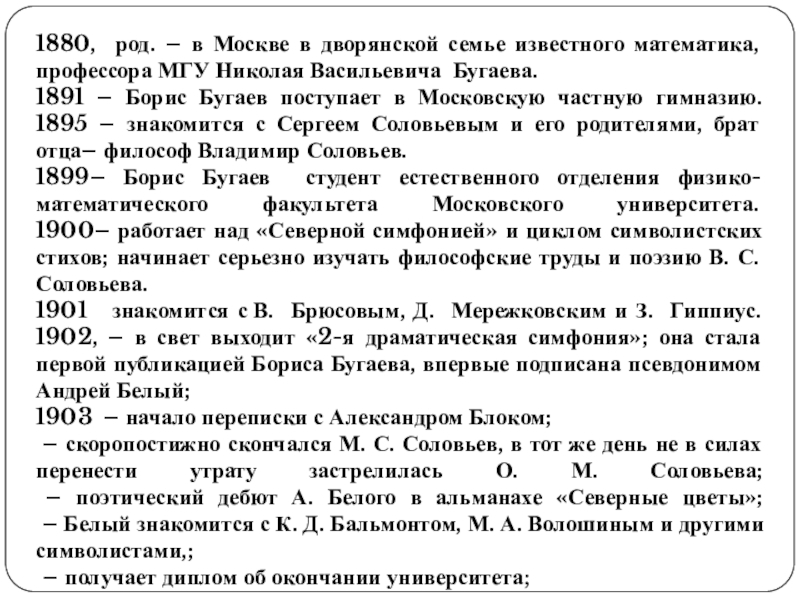 1900– работает над «Северной симфонией» и циклом символистских стихов; начинает серьезно изучать философские труды и поэзию В. С. Соловьева.