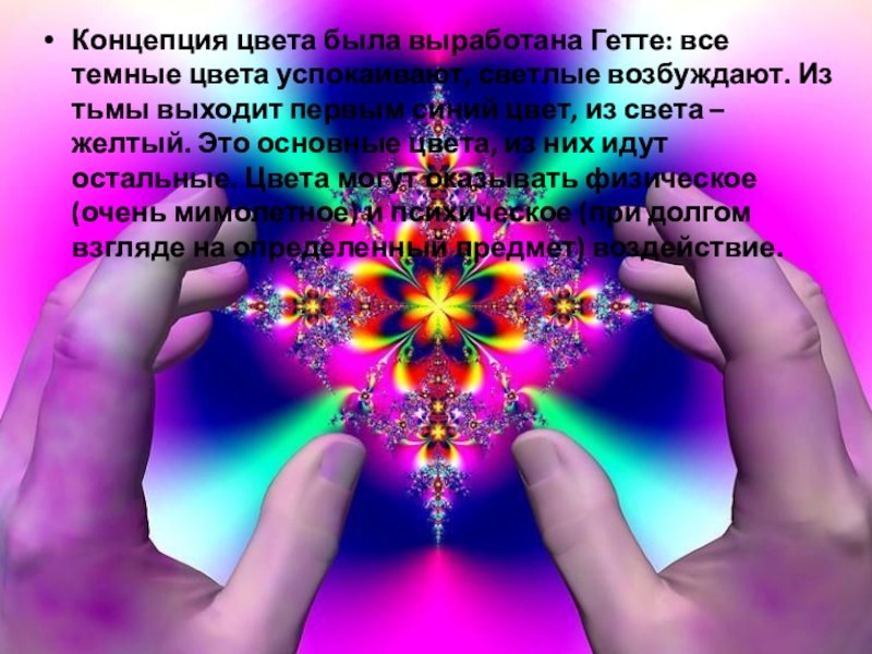Слайд 29Концепция цвета была выработана Гетте: все темные цвета успокаивают, светлые возбуждают.