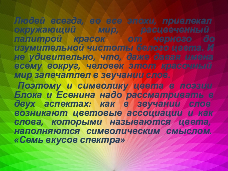 Поэтому и символику цвета в поэзии Блока и Есенина надо рассматривать в двух аспектах: как в звучании слов возникают цветовые ассоциации и как слова, которыми называются цвета, наполняются символическим смыслом. «Семь вкусов спектра»