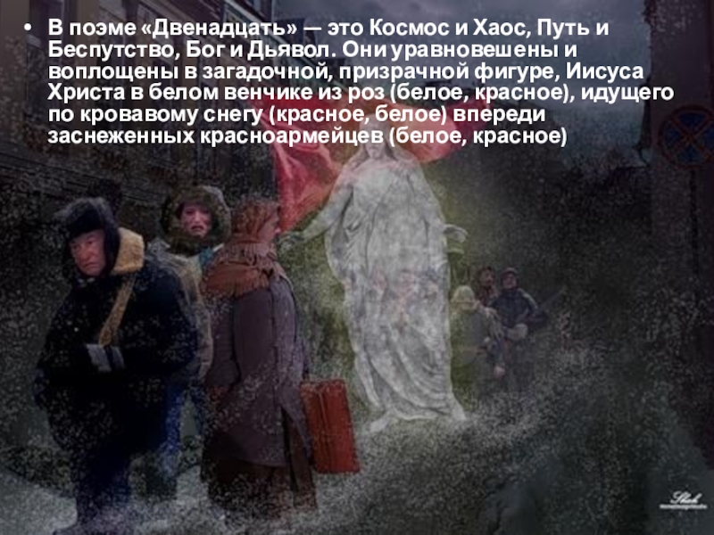 Бог и Дьявол. Они уравновешены и воплощены в загадочной, призрачной фигуре, Иисуса Христа в белом венчике из роз (белое, красное), идущего по кровавому снегу (красное, белое) впереди заснеженных красноармейцев (белое, красное)