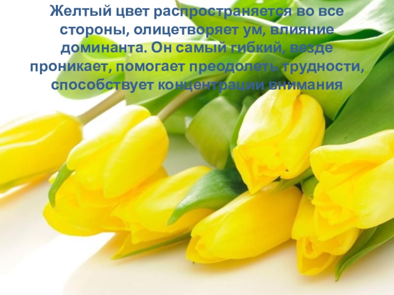 Слайд 34Желтый цвет распространяется во все стороны, олицетворяет ум, влияние доминанта. Он