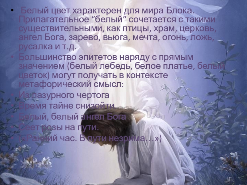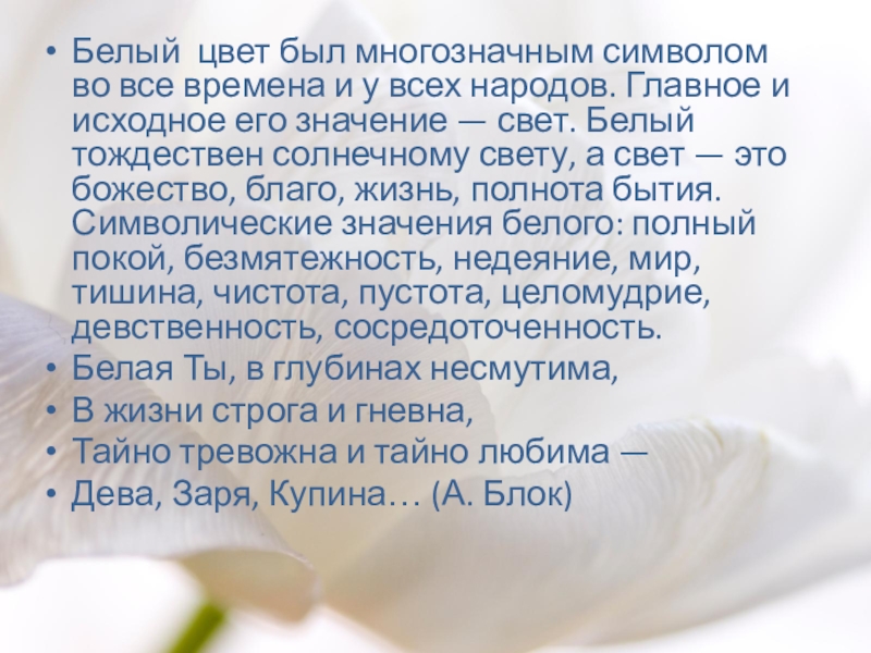 Слайд 12У А. А. Блока белый цвет и его оттенки: снежный, бледно-белый,