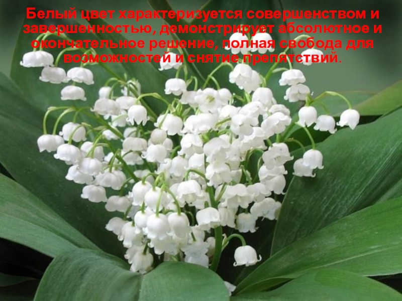 Слайд 30Белый цвет характеризуется совершенством и завершенностью, демонстрирует абсолютное и окончательное решение,