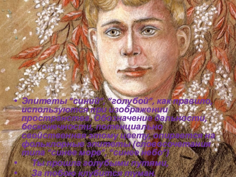 Слайд 23Эпитеты “синий”, “голубой”, как правило, используются при изображении пространства. Обозначение дальности,