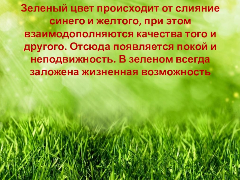 качества того и другого. Отсюда появляется покой и неподвижность. В зеленом всегда заложена жизненная возможность