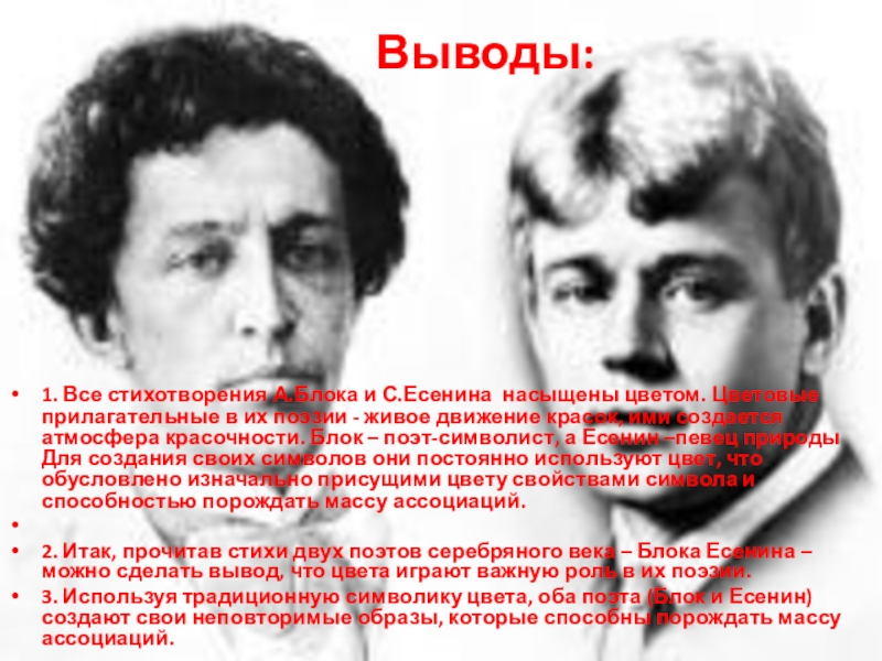 2. Итак, прочитав стихи двух поэтов серебряного века – Блока Есенина – можно сделать вывод, что цвета играют важную роль в их поэзии.