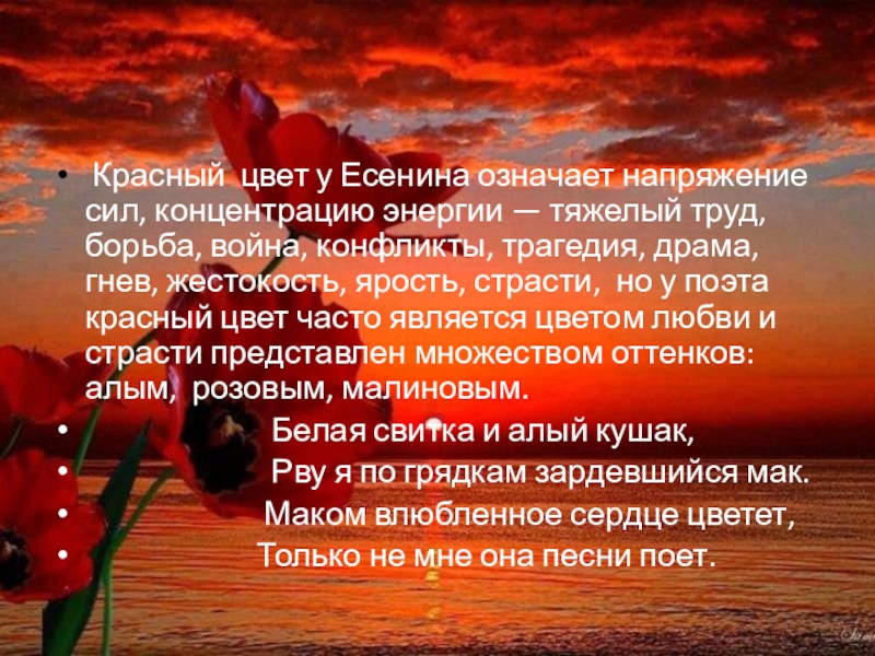 тяжелый труд, борьба, война, конфликты, трагедия, драма, гнев, жестокость, ярость, страсти, но у поэта красный цвет часто является цветом любви и страсти представлен множеством оттенков: алым, розовым, малиновым.