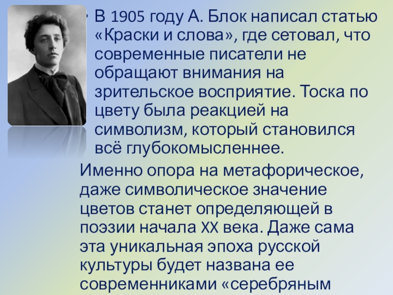 Слайд 8В 1905 году А. Блок написал статью «Краски и слова», где