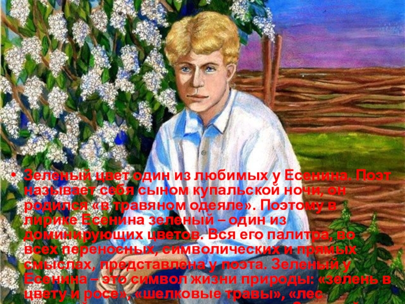 Слайд 22Зеленый цвет один из любимых у Есенина. Поэт называет себя сыном