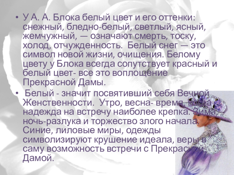 светлый, ясный, жемчужный, — означают смерть, тоску, холод, отчужденность. Белый снег — это символ новой жизни, очищения. Белому цвету у Блока всегда сопутствует красный и белый цвет- все это воплощение Прекрасной Дамы.