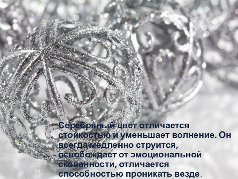 Слайд 31Серебряный цвет отличается стойкостью и уменьшает волнение. Он всегда медленно струится,