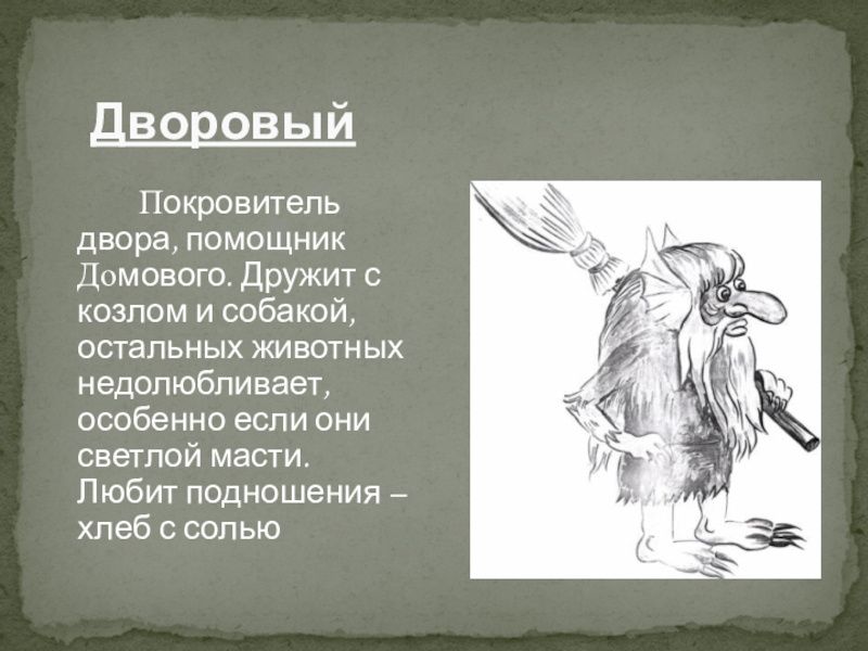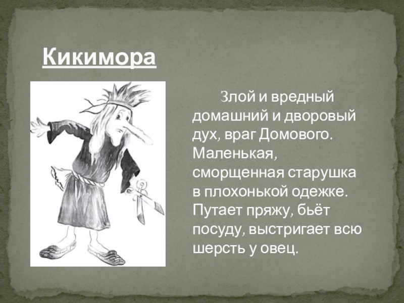 Злой и вредный домашний и дворовый дух, враг Домового. Маленькая, сморщенная