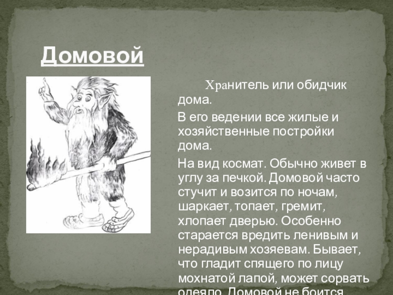 На вид космат. Обычно живет в углу за печкой. Домовой часто стучит и возится по ночам, шаркает, топает, гремит, хлопает дверью. Особенно старается вредить ленивым и нерадивым хозяевам. Бывает, что гладит спящего по лицу мохнатой лапой, может сорвать одеяло. Домовой не боится криков петуха.