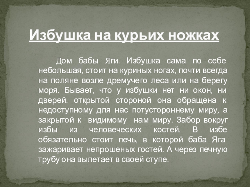 стоит на куриных ногах, почти всегда на поляне возле дремучего леса или на берегу моря. Бывает, что у избушки нет ни окон, ни дверей. открытой стороной она обращена к недоступному для нас потустороннему миру, а закрытой к видимому нам миру. Забор вокруг избы из человеческих костей. В избе обязательно стоит печь, в которой баба Яга зажаривает непрошеных гостей. А через печную трубу она вылетает в своей ступе.